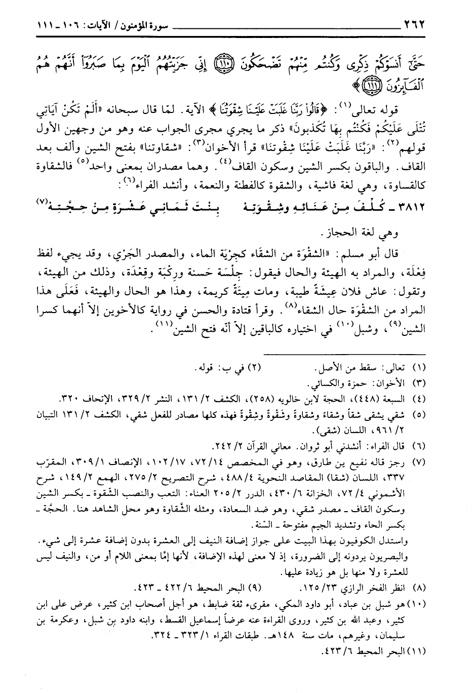 قوله تعالى: {قَالُواْ رَبَّنَا غَلَبَتْ عَلَيْنَا شِقْوَتُنَا} الآية. لمّا قال سبحانه {أَلَمْ تَكُنْ آيَاتِي تتلى عَلَيْكُمْ فَكُنْتُمْ بِهَا تُكَذِّبُونَ} [المؤمنون: 105] ذكر ما يجري مجرى الجواب عنه وهو من وجهين الأول قولهم: {رَبَّنَا غَلَبَتْ عَلَيْنَا شِقْوَتُنَا} قرأ الأخوان: «شقاوتنا» بفتح الشين وألف بعد القاف. والباقون بكسر الشين وسكون القاف. وهما مصدران بمعنى واحد فالشقاوة كالقساوة، وهي لغة فاشية، والشقوة كالفطنة والنعمة، وأنشد الفراء: