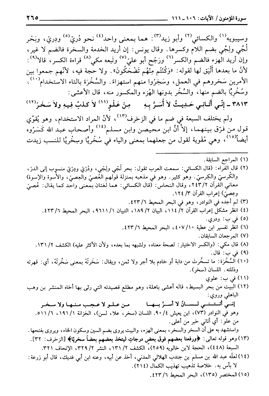 وسيبويه والكسائي وأبو زيد: هما بمعنى واحد نحو دُريّ ودِريّ، وبَحْر لُجِّي ولِجِّي بضم اللام وكسرها. وقال يونس: إن أريد الخدمة والسخرة فالضم لا غير، وإن أريد الهزء فالضم والكسر ورَجّح أبو عليّ وتَبعه مكي قراءة الكسر، قالا: لأنّ ما بعدها أَلْيَق لها لقوله: {وَكُنْتُمْ مِّنْهُمْ تَضْحَكُونَ} . ولا حجة فيه، لأنّهم جمعوا بين الأمرين سَخروهم في العمل، وسَخِرُوا منهم استهزاءً. والسُّخْرَة بالتاء الاستخدام وسُخْرِيًّا بالضم منها، والسُّخْر بدونها الهُزء والمكسور منه، قال الأعشى: