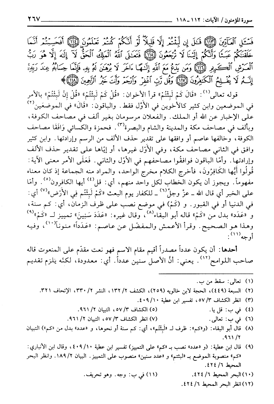 قوله تعالى: {قَالَ كَمْ لَبِثْتُمْ} قرأ الأخوان: {قُلْ كَمْ لَبِثْتُمْ} {قُلْ إِنْ لَبِثْتُمْ} بالأمر في الموضعين وابن كثير كالأخوين في الأوَّل فقط. والباقون: «قَالَ» في الموضعَين على الإخبار عن الله أو الملك. والفعلان مرسومان بغير ألف في مصاحف الكوفة، وبألف في مصاحف مكة والمدينة والشام والبصرة. فحمزة والكسائي وَافَقَا مصاحف الكوفة، وخالفها عاصم أو وافقها على تقدير حذف الألف من الرسم وإرادتها. وابن كثير وافق في الثاني مصاحف مكة، وفي الأَوّل غيرها، أو إيّاها على تقدير حذف الألف وإرادتها. وأمّا الباقون فوافقُوا مصاحفهم في الأوّل والثاني. فَعَلَى الأمر معنى الآية: قُولُوا أَيُّها الكَافِرُونَ، فأخرج الكلام مخرج الواحد، والمراد منه الجماعة إذ كان معناه مفهوماً. ويجوز أن يكون الخطاب لكل واحد منهم، أي: قل أيها الكافرون. وأمّا على الخبر أي قال الله - عزَّ وجلَّ - للكفار يوم البعث {كَمْ لَبِثْتُمْ فِي الأرض} أي: في الدنيا أو في القبور. و (كَمْ) في موضع نصب على ظرف الزمان، أي: كم سنة، و «عَدَد» بدل من «كَمْ» قاله أبو البقاء، وقال غيره: «عَدَدَ سَنِينَ» تمييز ل «كَمْ» وهذا هو الصحيح. وقرأ الأعمش والمفضّل عن عاصم: «عَدَداً» منوناً، وفيه أوجه: