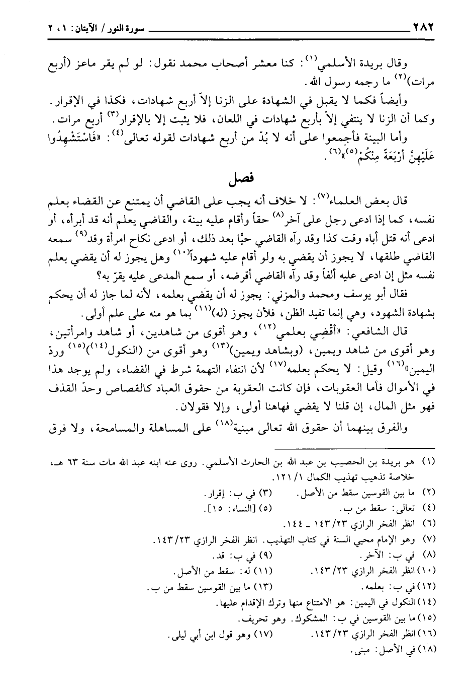 قال الشافعي: أقْضِي بعلمي، وهو أقوى من شاهدين، أو شاهد وامرأتين، وهو أقوى من شاهد ويمين، (وبشاهد ويمين) وهو أقوى من (النكول) وردّ اليمين «وقيل: لا يحكم بعلمه لأن انتفاء التهمة شرط في القضاء، ولم يوجد هذا في الأموال فأما العقوبات، فإن كانت العقوبة من حقوق العباد كالقصاص وحدّ القذف فهو مثل المال، إن قلنا لا يقضي فهاهنا أولى، وإلا فقولان.
