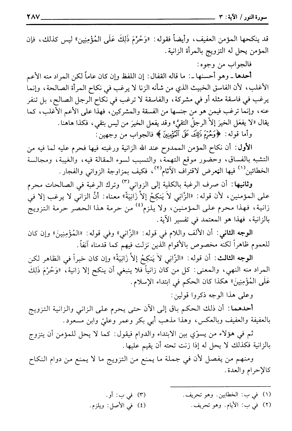 وثانيها: أن صرف الرغبة بالكلية إلى الزواني وترك الرغبة في الصالحات محرم على المؤمنين، لأن قوله: {الزاني لاَ يَنكِحُ إِلاَّ زَانِيَةً} معناه: أنَّ الزاني لا يرغب إلا في زانية، فهذا محرم على المؤمنين، ولا يلزم من حرمة هذا الحصر حرمة التزويج بالزانية، فهذا هو المعتمد في تفسير الآية.
