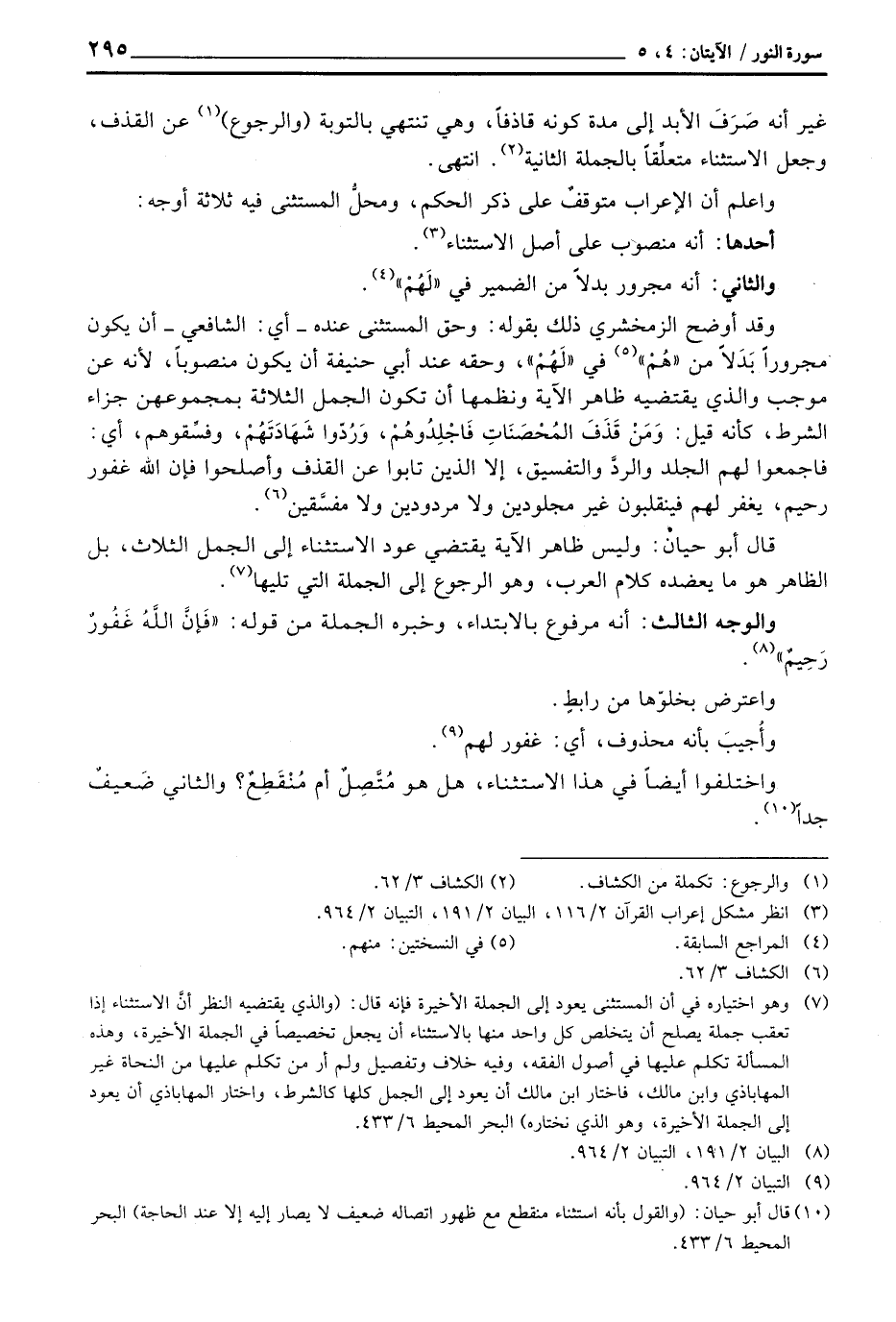 وقد أوضح الزمخشري ذلك بقوله: وحق المستثنى عنده - أي: الشافعي - أن يكون مجروراً بَدَلاً من «هُمْ» في «لَهُمْ» ، وحقه عند أبي حنيفة أن يكون منصوباً، لأنه عن موجب والذي يقتضيه ظاهر الآية ونظمها أن تكون الجمل الثلاثة بمجموعهن جزاء الشرط، كأنه قيل: وَمَنْ قَذَفَ المُحْصَنَاتِ فَاجْلِدُوهُمْ، وَرُدّوا شَهَادَتَهُمْ، وفسِّقوهم، أي: فاجمعوا لهم الجلد والردَّ والتفسيق، إلا الذين تابوا عن القذف وأصلحوا فإن الله غفور رحيم، يغفر لهم فينقلبون غير مجلودين ولا مردودين ولا مفسَّقين.