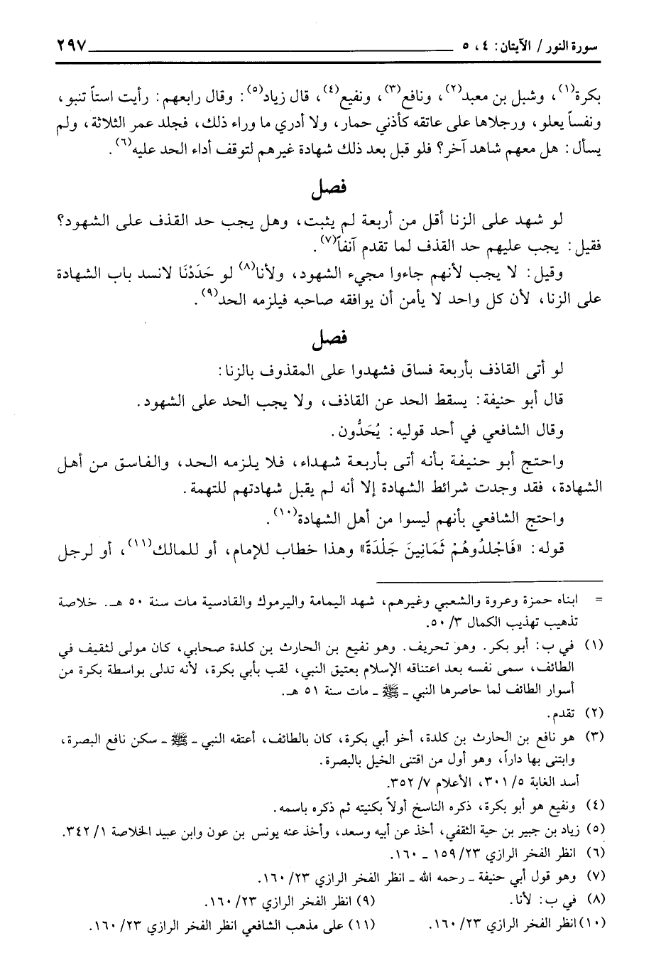 بكرة، وشبل بن معبد، ونافع، ونفيع، قال زياد: وقال رابعهم: رأيت استاً تنبو، ونفساً يعلو، ورجلاها على عاتقه كأذني حمار، ولا أدري ما وراء ذلك، فجلد عمر الثلاثة، ولم يسأل: هل معهم شاهد آخر؟ فلو قبل بعد ذلك شهادة غيرهم لتوقف أداء الحد عليه.