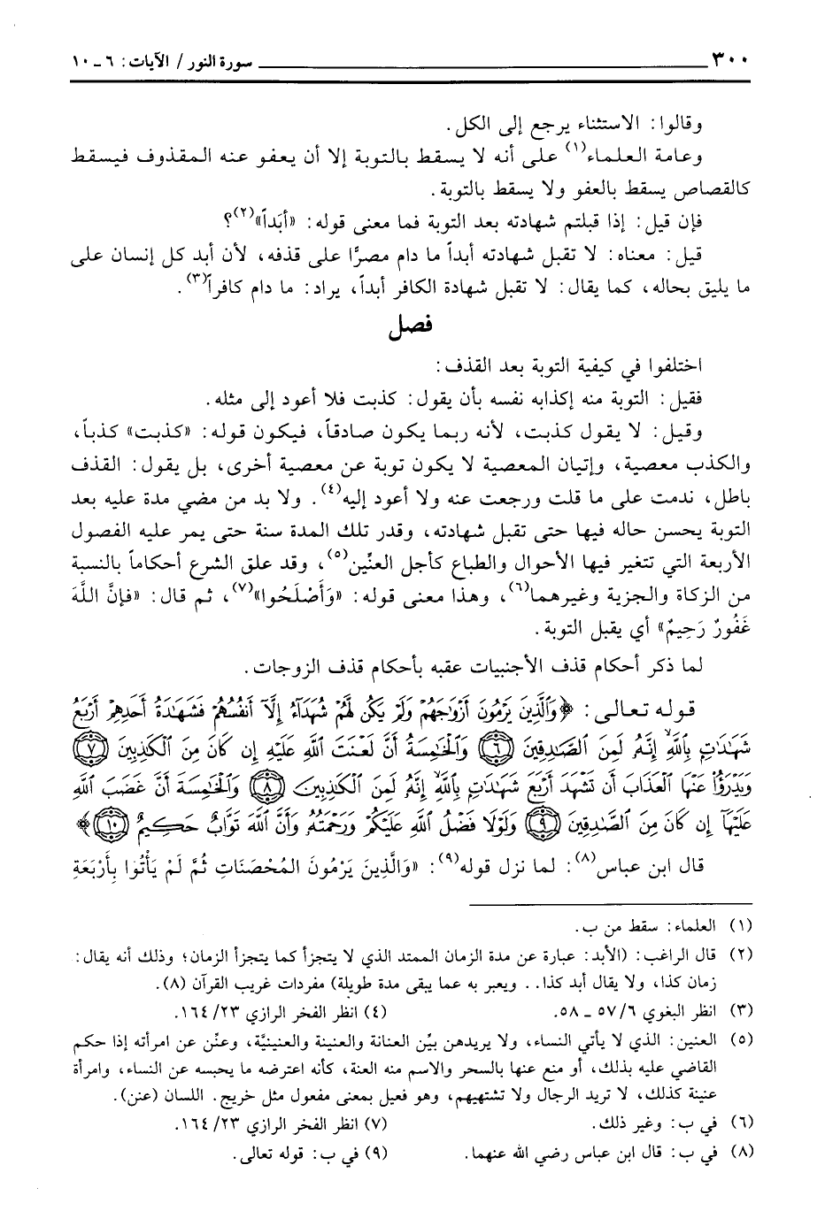 وقيل: لا يقول كذبت، لأنه ربما يكون صادقاً، فيكون قوله: «كذبت» كذباً، والكذب معصية، وإتيان المعصية لا يكون توبة عن معصية أخرى، بل يقول: القذف باطل، ندمت على ما قلت ورجعت عنه ولا أعود إليه. ولا بد من مضي مدة عليه بعد التوبة يحسن حاله فيها حتى تقبل شهادته، وقدر تلك المدة سنة حتى يمر عليه الفصول الأربعة التي تتغير فيها الأحوال والطباع كأجل العنِّين، وقد علق الشرع أحكاماً بالنسبة من الزكاة والجزية وغيرهما، وهذا معنى قوله: «وَأَصْلَحُوا» ، ثم قال: {فَإِنَّ الله غَفُورٌ رَّحِيمٌ} أي يقبل التوبة.