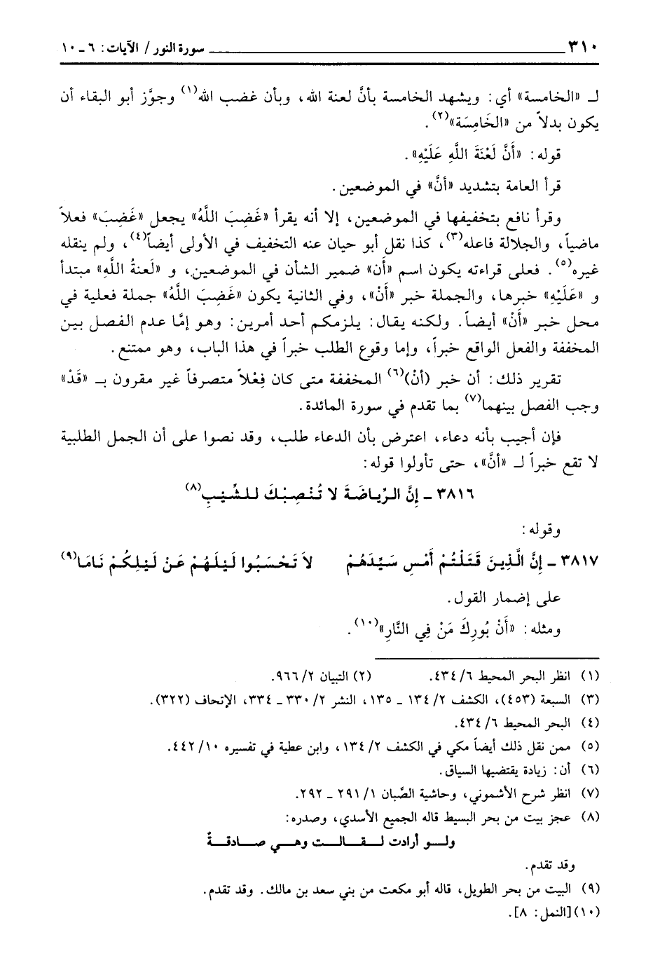 وقرأ نافع بتخفيفها في الموضعين، إلا أنه يقرأ «غَضِبَ اللَّهُ» يجعل «غَضِبَ» فعلاً ماضياً، والجلالة فاعله، كذا نقل أبو حيان عنه التخفيف في الأولى أيضاً، ولم ينقله غيره. فعلى قراءته يكون اسم «أَن» ضمير الشأن في الموضعين، و «لَعنةُ اللَّهِ» مبتدأ و «عَلَيْهِ» خبرها، والجملة خبر «أَنْ» ، وفي الثانية يكون «غَضِبَ اللَّهُ» جملة فعلية في محل خبر «أَنْ» أيضاً. ولكنه يقال: يلزمكم أحد أمرين: وهو إمَّا عدم الفصل بين المخففة والفعل الواقع خبراً، وإما وقوع الطلب خبراً في هذا الباب، وهو ممتنع.