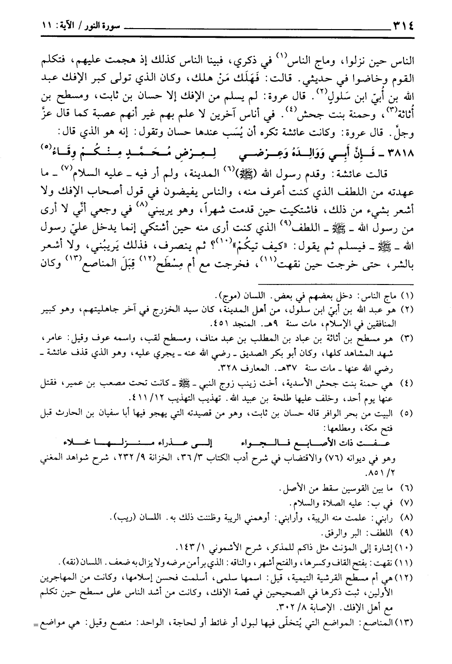 قالت: فَهَلَك مَنْ هلك، وكان الذي تولى كبر الإفك عبد الله بن أُبيّ ابن سَلولٍ. قال عروة: لم يسلم من الإفك إلا حسان بن ثابت، ومسطح بن أُثاثة، وحمنة بنت جحش. في أناس آخرين لا علم بهم غير أنهم عصبة كما قال عزَّ وجلَّ. قال عروة: وكانت عائشة تكره أن يُسَب عندها حسان وتقول: إنه هو الذي قال: