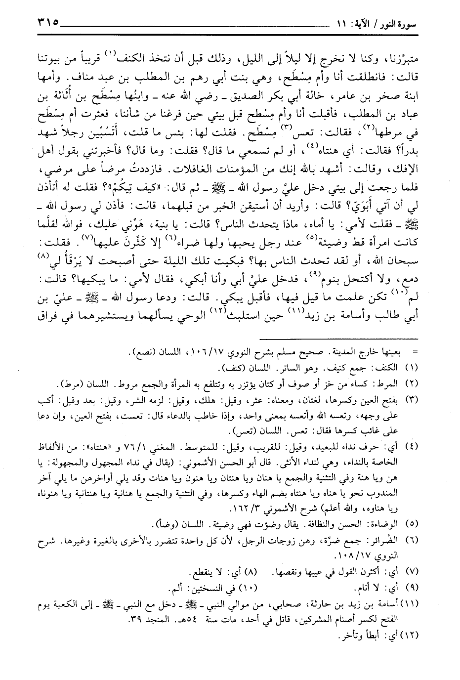 متبرَّزنا، وكنا لا نخرج إلا ليلاً إلى الليل، وذلك قبل أن نتخذ الكنف قريباً من بيوتنا قالت: فانطلقت أنا وأم مِسْطَح، وهي بنت أبي رهم بن المطلب بن عبد مناف. وأمها ابنة صخر بن عامر، خالة أبي بكر الصديق - رَضِيَ اللَّهُ عَنْه - وابنُها مِسْطَح بن أُثَاثة بن عباد بن المطلب، فأقبلت أنا وأم مِسْطح قبل بيتي حين فرغنا من شأننا، فعثرت أم مِسْطَح في مرطها، فقالت: تعس مِسْطَح. فقلت لها: بئس ما قلت، أَتَسُبِّين رجلاً شهد بدراً؟ فقالت: أي هنتاه، أو لم تسمعي ما قال؟ فقلت: وما قال؟ فأخبرتني بقول أهل الإفك، وقالت: أشهد بالله إنك من المؤمنات الغافلات. فازددتُ مرضاً على مرضي، فلما رجعت إلى بيتي دخل عليَّ رسول الله - صَلَّى اللَّهُ عَلَيْهِ وَسَلَّم َ - ثم قال: «كيف تِيكُمْ» ؟ فقلت له أتأذن لي أن آتي أَبَوَيّ؟ قالت: وأريد أن أستيقن الخبر من قبلهما، قالت: فأذن لي رسول الله - صَلَّى اللَّهُ عَلَيْهِ وَسَلَّم َ - فقلت لأمي: يا أماه، ماذا يتحدث الناس؟ قالت: يا بنية، هَوِّني عليك، فوالله لقلَّما كانت امرأة قط وضيئة عند رجل يحبها ولها ضراء إلا كَثَّرنَ عليها.