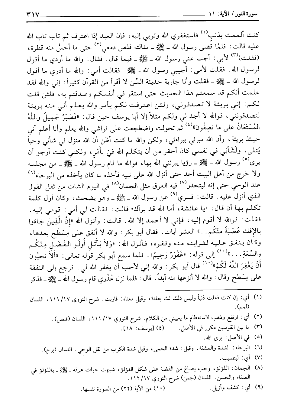 كنت ألممت بذنبٍ فاستغفري الله وتوبي إليه، فإن العبد إذا اعترف ثم تاب تاب الله عليه قالت: فلمَّا قضى رسول الله - صَلَّى اللَّهُ عَلَيْهِ وَسَلَّم َ - مقالته قلص دمعي حتى ما أحسُّ منه قطرة، (فقلت) لأبي: أجب عني رسول الله - صَلَّى اللَّهُ عَلَيْهِ وَسَلَّم َ - فيما قال.