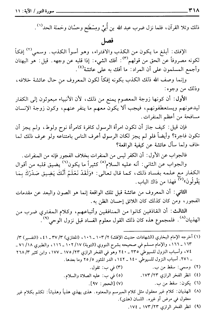 فإن قيل: كيف جاز أن تكون امرأة الرسول كافرة كامرأة نوح ولوط، ولم يجز أن تكون فاجرة؟ وأيضاً فلو لم يجز لكان الرسول أعرف الناس بامتناعه ولو عرف ذلك لما خاف ولما سأل عائشة عن كيفية الواقعة؟