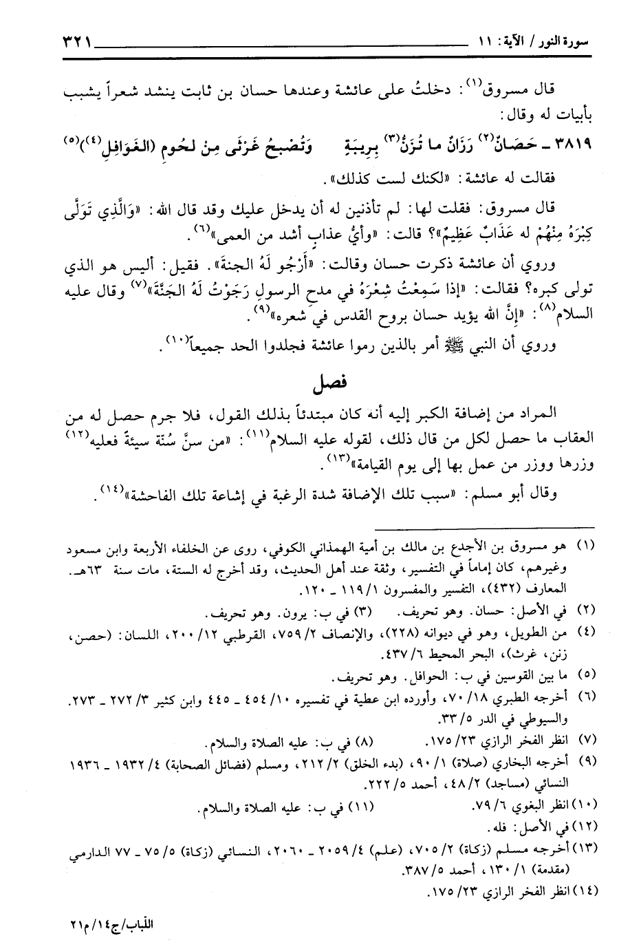 قال مسروق: فقلت لها: لم تأذنين له أن يدخل عليك وقد قال الله: « {والذي تولى كِبْرَهُ مِنْهُمْ لَهُ عَذَابٌ عَظِيمٌ} ؟ قالت:» وأيُّ عذابٍ أشد من العمى «.