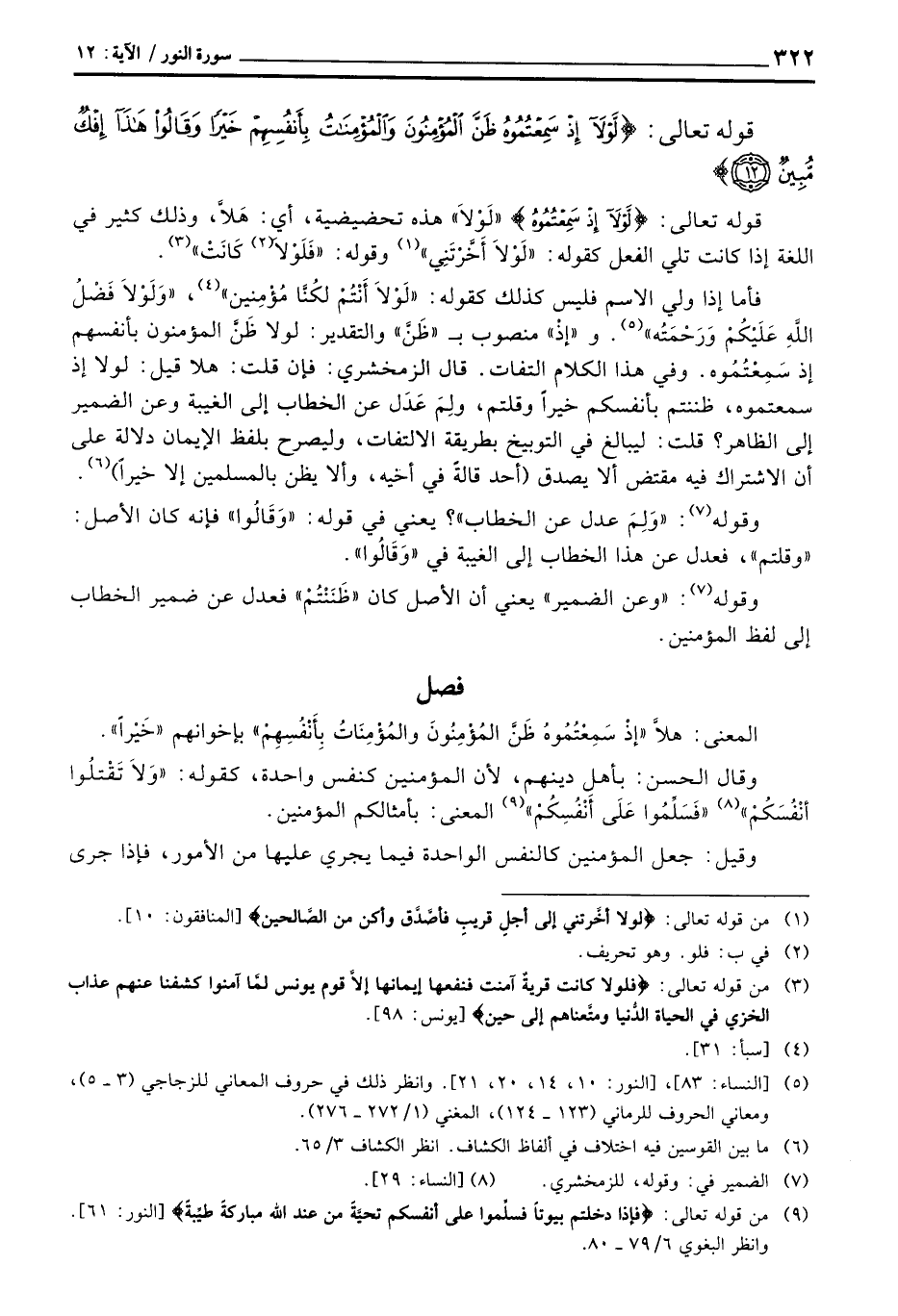 فأما إذا ولي الاسم فليس كذلك كقوله: {لَوْلاَ أَنتُمْ لَكُنَّا مُؤْمِنِينَ} [سبأ: 31] ، {وَلَوْلاَ فَضْلُ الله عَلَيْكُمْ وَرَحْمَتُهُ} [النور: 21] . و «إذْ» منصوب ب «ظَنَّ» والتقدير: لولا ظَنَّ المؤمنون بأنفسهم إذ سَمِعْتُمُوه. وفي هذا الكلام التفات. قال الزمخشري: فإن قلت: هلا قيل: لولا إذ سمعتموه، ظننتم بأنفسكم خيراً وقلتم، ولِمَ عَدَل عن الخطاب إلى الغيبة وعن الضمير إلى الظاهر؟ قلت: ليبالغ في التوبيخ بطريقة الالتفات، وليصرح بلفظ الإيمان دلالة على أن الاشتراك فيه مقتض ألا يصدق (أحد قالةً في أخيه، وألا يظن بالمسلمين إلا خيراً) .