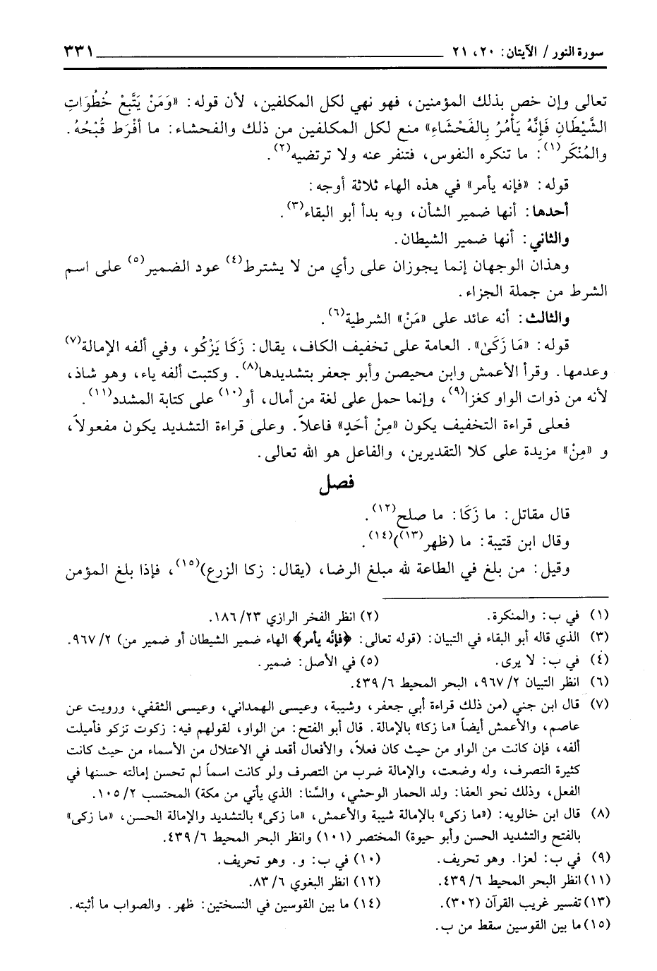 قوله: «مَا زَكَى» . العامة على تخفيف الكاف، يقال: زَكَا يَزْكُو، وفي ألفه الإمالة وعدمها. وقرأ الأعمش وابن محيصن وأبو جعفر بتشديدها. وكتبت ألفه ياء، وهو شاذ، لأنه من ذوات الواو كغزا، وإنما حمل على لغة من أمال، أو على كتابة المشدد.