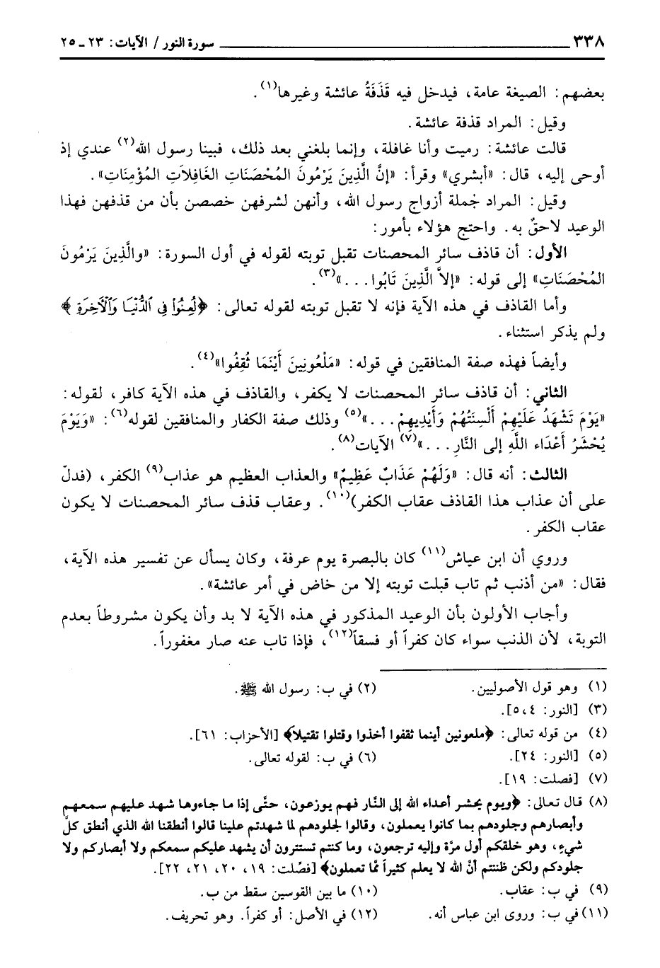 الثالث: أنه قال: {وَلَهُمْ عَذَابٌ عَظِيمٌ} والعذاب العظيم هو عذاب الكفر، (فدلّ على أن عذاب هذا القاذف عقاب الكفر) . وعقاب قذف سائر المحصنات لا يكون عقاب الكفر.
