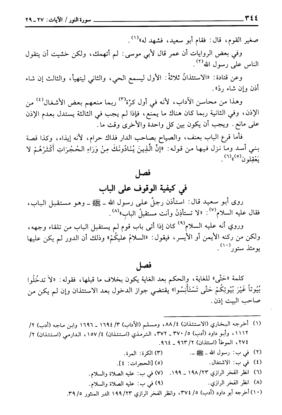 «وروي أنه عليه السلام كان إذا أتى باب قوم لم يستقبل الباب من تلقاء وجهه، ولكن من ركنه الأيمن أو الأيسر، فيقول:» السلامُ عليكُمْ «وذلك أن الدور لم يكن عليها يومئذ ستور.
