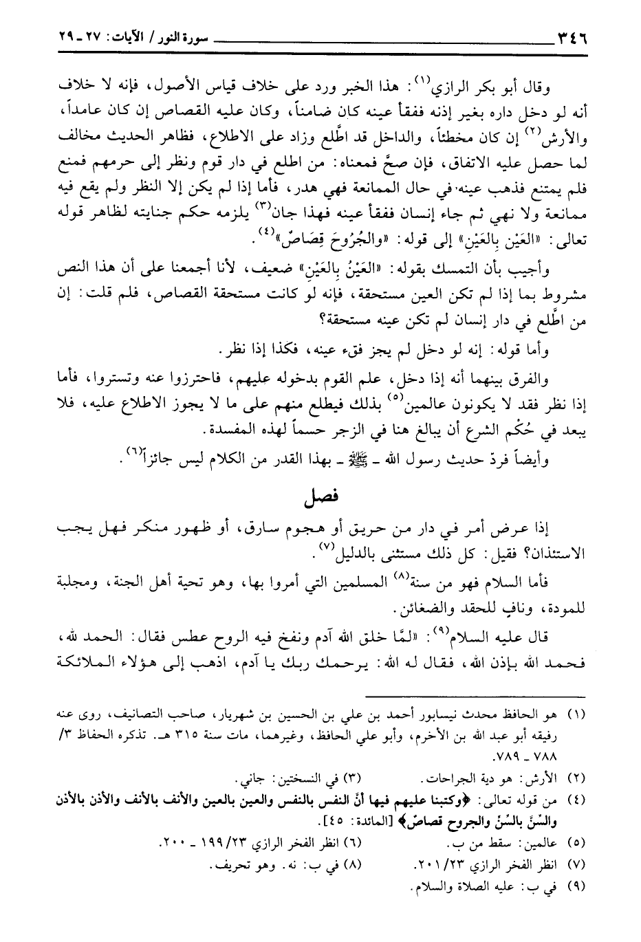 وقال أبو بكر الرازي: هذا الخبر ورد على خلاف قياس الأصول، فإنه لا خلاف أنه لو دخل داره بغير إذنه ففقأ عينه كان ضامناً، وكان عليه القصاص إن كان عامداً، والأرش إن كان مخطئاً، والداخل قد اطَّلع وزاد على الاطلاع، فظاهر الحديث مخالف لما حصل عليه الاتفاق، فإن صحَّ فمعناه: من اطلع في دار قوم ونظر إلى حرمهم فمنع فلم يمتنع فذهب عينه في حال الممانعة فهي هدر، فأما إذا لم يكن إلا النظر ولم يقع فيه ممانعة ولا نهي ثم جاء إنسان ففقأ عينه فهذا جان يلزمه حكم جنايته لظاهر قوله تعالى:» العَيْن بِالعَيْنِ «إلى قوله:» والجُرُوحَ قِصَاصٌ «.