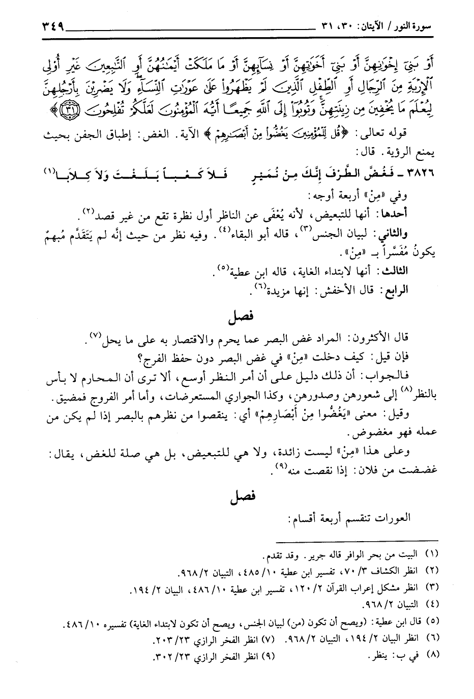 قوله تعالى: {قُلْ لِّلْمُؤْمِنِينَ يَغُضُّواْ مِنْ أَبْصَارِهِمْ} الآية. الغض: إطباق الجفن بحيث يمنع الرؤية. قال: