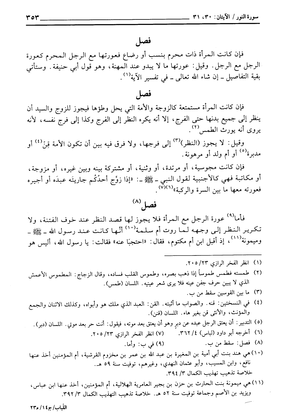 فإن كانت المرأة ذات محرم بنسب أو رضاع فعورتها مع الرجل المحرم كعورة الرجل مع الرجل. وقيل: عورتها ما لا يبدو عند المهنة، وهو قول أبي حنيفة. وستأتي بقية التفاصيل - إن شاء الله تعالى - في تفسير الآية.