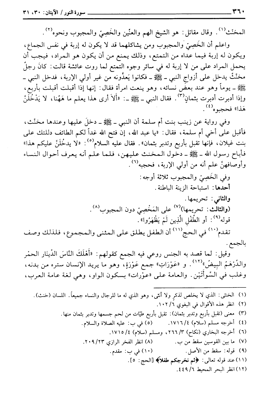 «كانَ رجلٌ مخنَّثٌ يدخل على أزواج - النبي صَلَّى اللَّهُ عَلَيْهِ وَسَلَّم َ - فكانوا يَعدُّونه من غير أولي الإربة، فدخل النبي - صَلَّى اللَّهُ عَلَيْهِ وَسَلَّم َ - يوماً وهو عند بعض نسائه، وهو ينعت امرأة فقال: إنها إذا أقبلت أقبلت بأربع، وإذا أدبرت أدبرت بثمانٍ. فقال النبي - صَلَّى اللَّهُ عَلَيْهِ وَسَلَّم َ -:» أَلاَ أرى هذا يعلم ما هَهُنا، لا يَدْخُلَنَّ هَذا «فحجبوه» .