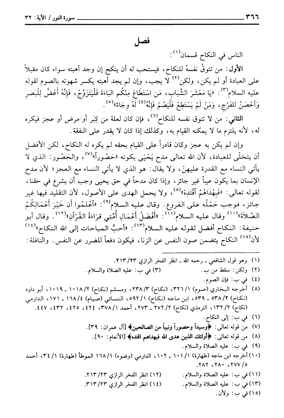 الأول: من تتوقُ نفسُه للنكاح، فيستحب له أن ينكح إن وجد أهبته سواء كان مقبلاً على العبادة أو لم يكن، ولكن لا يجب، وإن لم يجد أهبته يكسر شهوته بالصوم لقوله عليه السلام: «يَا مَعْشَرَ الشَّبابِ، مَن اسْتَطَاعَ مِنْكُم البَاءَةَ فَلْيَتَزَوَّجْ، فَإِنَّهُ أَغَضُّ لِلْبَصَرِ وَأحْصَنُ للفَرْجِ، وَمَنْ لَمْ يَسْتَطِعْ فَلْيَصُمْ فَإِنَّهُ لَهُ وِجَاءٌ» .