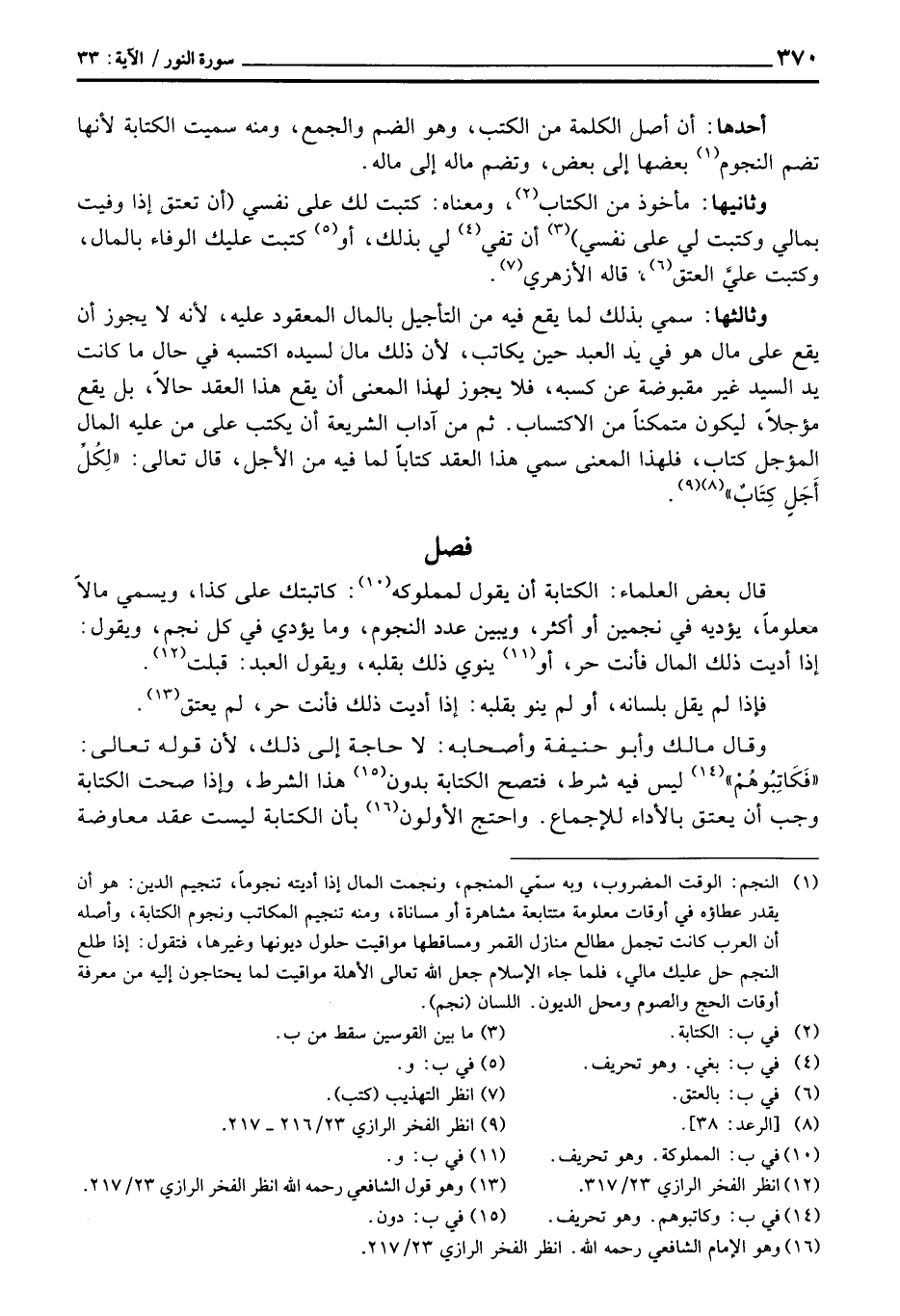 وثانيها: مأخوذ من الكتاب، ومعناه: كتبت لك على نفسي (أن تعتق إذا وفيت بمالي وكتبت لي على نفسي) أن تفي لي بذلك، أو كتبت عليك الوفاء بالمال، وكتبت عليَّ العتق، قاله الأزهري.