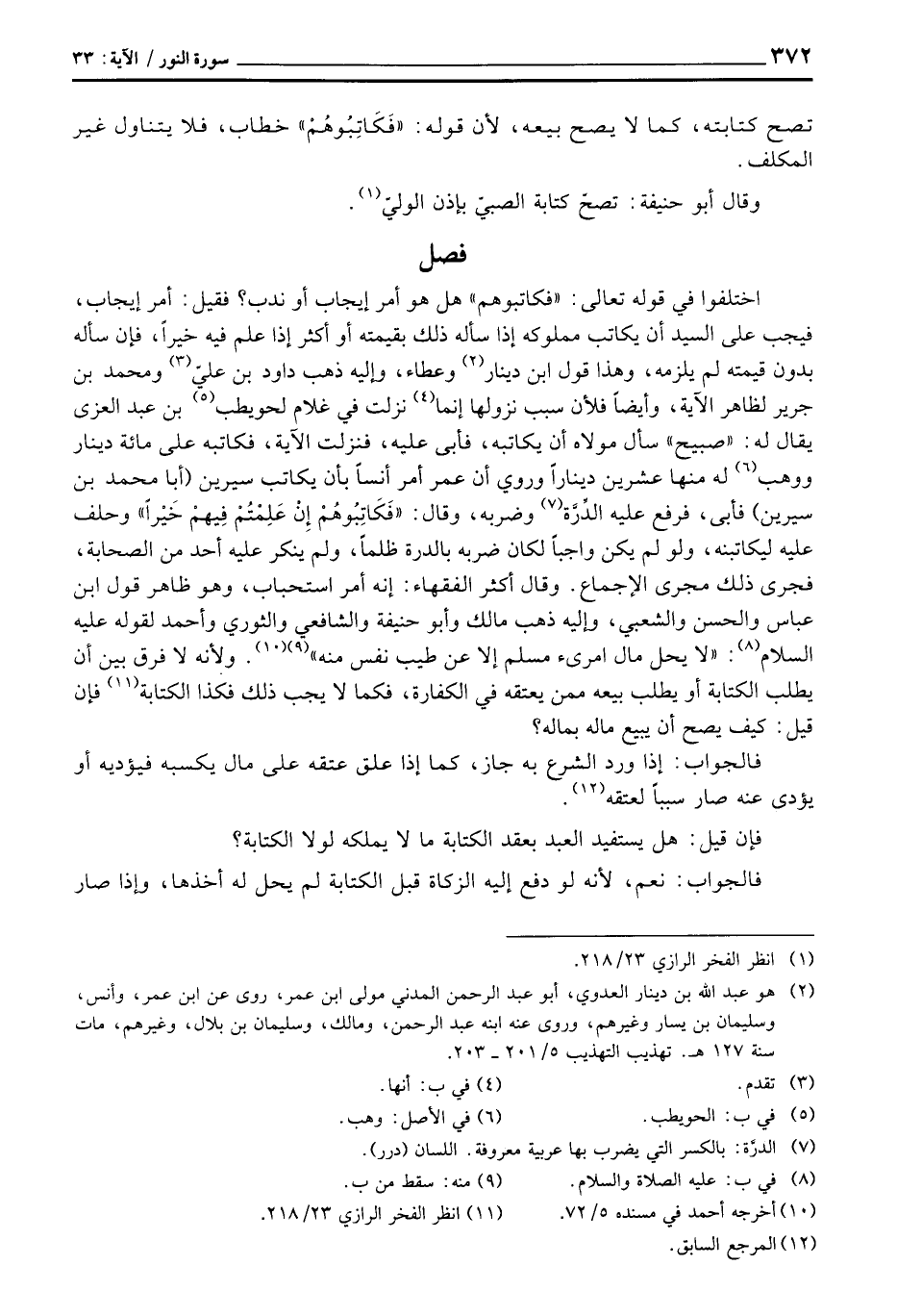 اختلفوا في قوله تعالى: «فكاتبوهم» هل هو أمر إيجاب أو ندب؟ فقيل: أمر إيجاب، فيجب على السيد أن يكاتب مملوكه إذا سأله ذلك بقيمته أو أكثر إذا علم فيه خيراً، فإن سأله بدون قيمته لم يلزمه، وهذا قول ابن دينار وعطاء، وإليه ذهب داود بن عليّ ومحمد بن جرير لظاهر الآية، وأيضاً فلأن سبب نزولها إنما نزلت في غلام لحويطب بن عبد العزى يقال له: «صبيح» سأل مولاه أن يكاتبه، فأبى عليه، فنزلت الآية، فكاتبه على مائة دينار ووهب له منها عشرين ديناراً وروي أن عمر أمر أنساً بأن يكاتب سيرين (أبا محمد بن سيرين) فأبى، فرفع عليه الدِّرَّة وضربه، وقال: «فَكَاتِبُوهُمْ إِنْ عَلِمْتُمْ فِيهمْ خَيْراً» وحلف عليه ليكاتبنه، ولو لم يكن واجباً لكان ضربه بالدرة ظلماً، ولم ينكر عليه أحد من الصحابة، فجرى ذلك مجرى الإجماع.