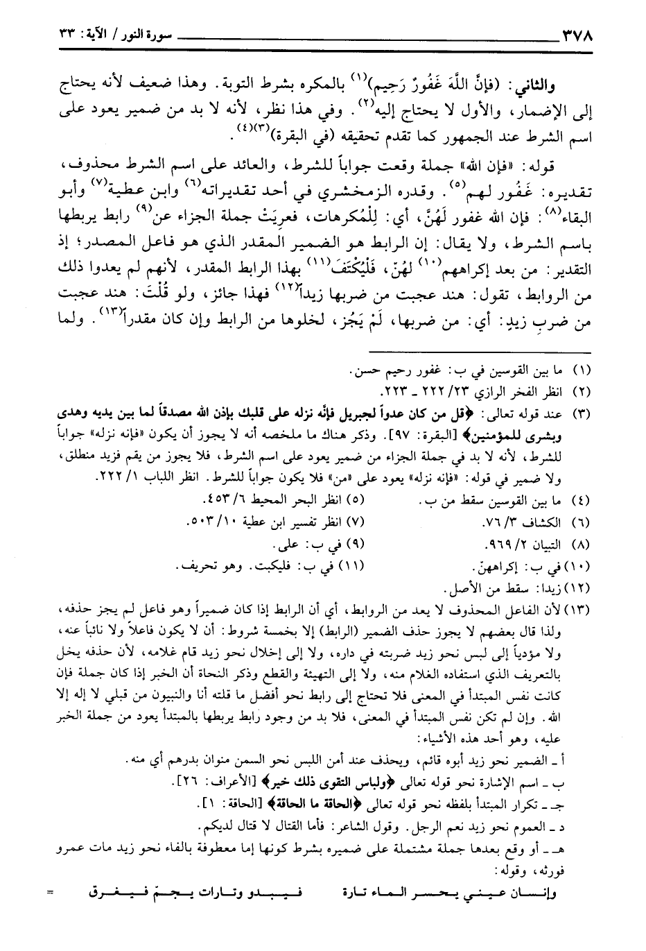 قوله: «فإن الله» جملة وقعت جواباً للشرط، والعائد على اسم الشرط محذوف، تقديره: غَفُور لهم. وقدره الزمخشري في أحد تقديراته وابن عطية وأبو البقاء: فإن الله غفور لَهُنَّ، أي: لِلْمُكرهات، فعرِيَتْ جملة الجزاء عن رابط يربطها باسم الشرط، ولا يقال: إن الرابط هو الضمير المقدر الذي هو فاعل المصدر؛ إذ التقدير: من بعد إكراههم لهُنّ، فَلْيُكْتَفَ بهذا الرابط المقدر، لأنهم لم يعدوا ذلك من الروابط، تقول: هند عجبت من ضربها زيداً فهذا جائز، ولو قُلْتَ: هند عجبت من ضربِ زيدٍ: أي: من ضربها، لَمْ يَجُز، لخلوها من الرابط وإن كان مقدراً. ولما