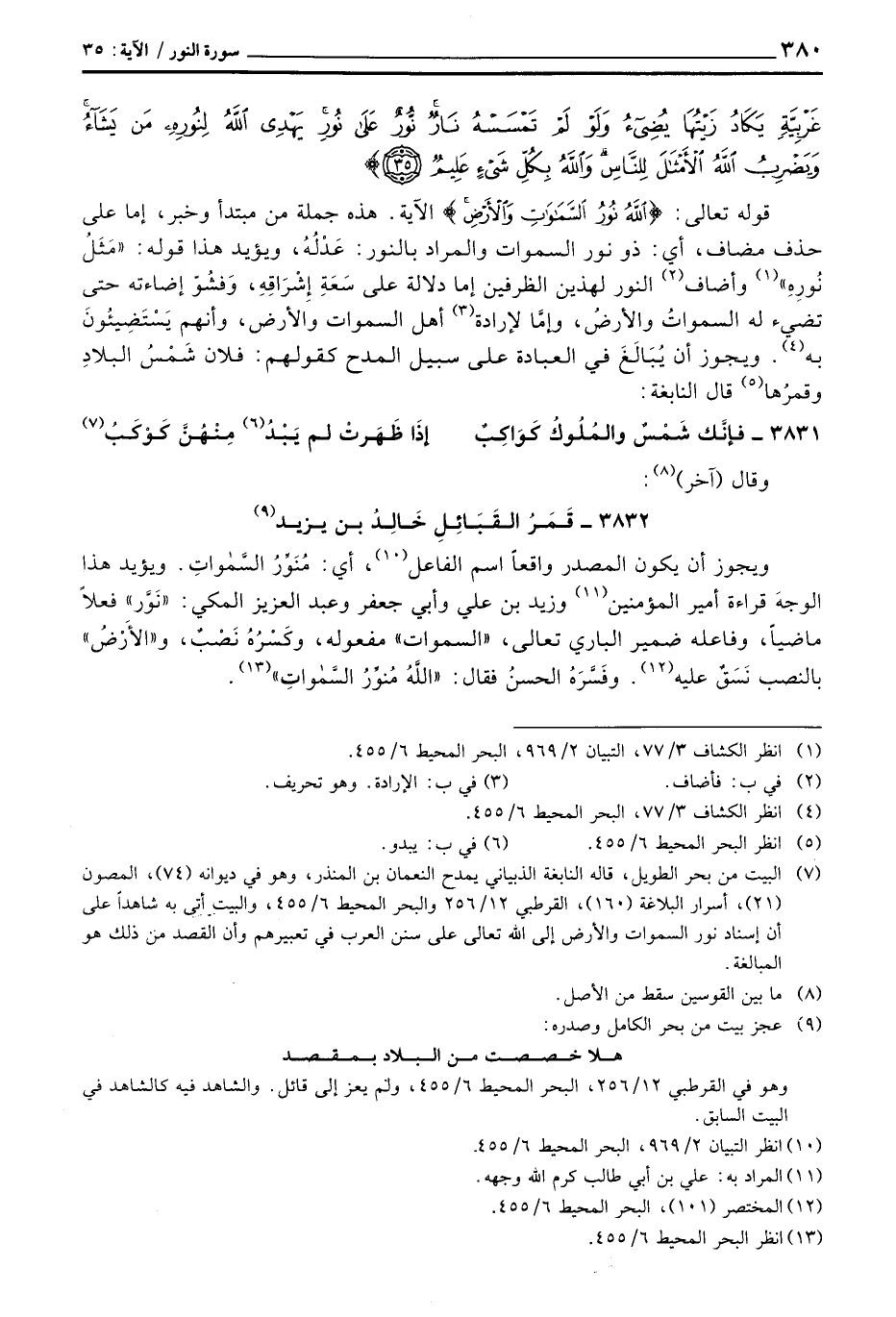 3832 - قَمَرُ القَبَائِلِ خَالِدُ بن يزيد ... ويجوز أن يكون المصدر واقعاً اسم الفاعل، أي: مُنَوِّرُ السَّمواتِ. ويؤيد هذا الوجهَ قراءة أمير المؤمنين وزيد بن علي وأبي جعفر وعبد العزيز المكي: «نَوَّر» فعلاً ماضياً، وفاعله ضمير الباري تعالى، «السموات» مفعوله، وكَسْرُهُ نَصْبٌ، و «الأَرْضُ» بالنصب نَسَقٌ عليه. وفَسَّرَهُ الحسنُ فقال: «اللَّهُ مُنوِّرُ السَّمواتِ» .