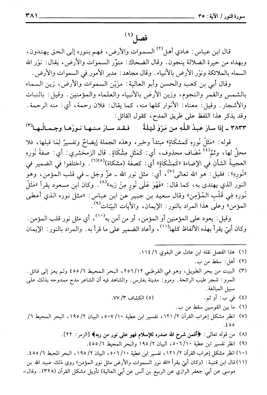 قوله: {مَثَلُ نُورِهِ كَمِشْكَاةٍ} مبتدأ وخبر، وهذه الجملة إيضاحٌ وتفسيرٌ لِمَا قبلها، فلا محلَّ لها، وثمَّ مُضَاف محذوف، أي: كَمَثَلِ مِشْكَاةٍ. قال الزمخشري: أي: صفةُ نُورِهِ العجيبةُ الشأنِ في الإضاءة «كَمِشْكَاةٍ» أي: كصفة (مشكاة) . واختلفوا في الضمير في «نُورِهِ» : فقيل: هو الله تعالى، أي: مثل نور الله - عزَّ وجلَّ - في قلب المؤمن، وهو النور الذي يهتدى به، كما قال: {فَهُوَ على نُورٍ مِّن رَّبِّهِ} [الزمر: 22] . وكان ابن مسعود يقرأ «مَثَلُ نُورِهِ فِي قَلْبِ المُؤْمِن» وقال سعيد بن جبير عن ابن عباس: «مثل نوره الذي أعطى المؤمن» وعلى هذا المراد بالنور: الإيمان، والآيات البيّنات.
