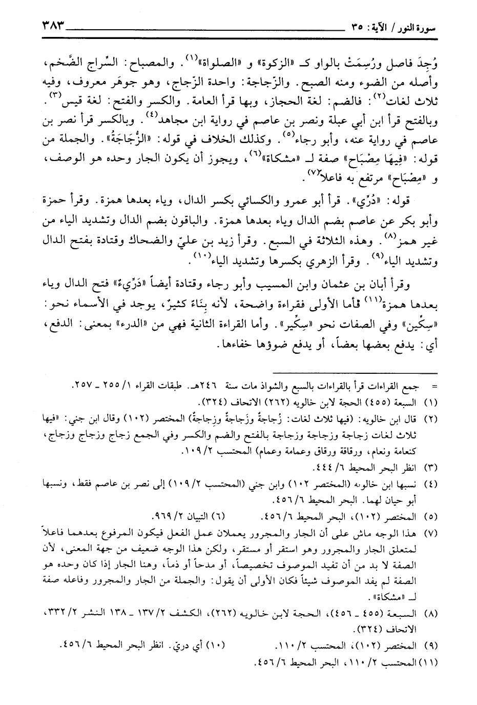 وُجِدَ فاصل ورُسِمَتْ بالواو ك «الزكوة» و «الصلواة» . والمصباح: السِّراج الضَّخم، وأصله من الضوء ومنه الصبح. والزّجاجة: واحدة الزّجاج، وهو جوهَر معروف، وفيه ثلاث لغات: فالضم: لغة الحجاز، وبها قرأ العامة. والكسر والفتح: لغة قيس. وبالفتح قرأ ابن أبي عبلة ونصر بن عاصم في رواية ابن مجاهد. وبالكسر قرأ نصر بن عاصم في رواية عنه، وأبو رجاء. وكذلك الخلاف في قوله: «الزُّجَاجَةُ» . والجملة من قوله: «فِيهَا مِصْبَاح» صفة ل «مشكاة» ، ويجوز أن يكون الجار وحده هو الوصف، و «مِصْبَاح» مرتفع به فاعلاً.