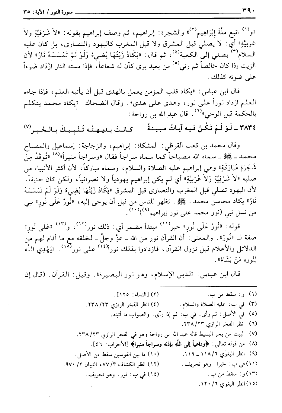 وقال محمد بن كعب القرظي: المشكاة: إبراهيم، والزجاجة: إسماعيل والمصباح محمد - صَلَّى اللَّهُ عَلَيْهِ وَسَلَّم َ - سماه الله مصباحاً كما سماه سراجاً فقال «وسراجاً منيراً» {يُوقَدُ مِنْ شَجَرَةٍ مُبَارَكَةٍ} وهي إبراهيم عَلَيْهِ الصَّلَاة وَالسَّلَام ُ، وسماه مباركاً، لأن أكثر الأنبياء من صلبه {لاَّ شَرْقِيَّةٍ وَلاَ غَرْبِيَّةٍ} أي لم يكن إبراهيم يهودياً ولا نصرانياً، ولكن كان حنيفاً، لأن اليهود تصلي قبل المغرب والنصارى قبل المشرق {يَكَادُ زَيْتُهَا يضياء وَلَوْ لَمْ تَمْسَسْهُ نَارٌ} يكاد محاسن محمد - صَلَّى اللَّهُ عَلَيْهِ وَسَلَّم َ - تظهر للناس من قبل أن يوحى إليه، {نُّورٌ على نُورٍ} نبي من نسل نبي (نور محمد على نور إبراهيم) .
