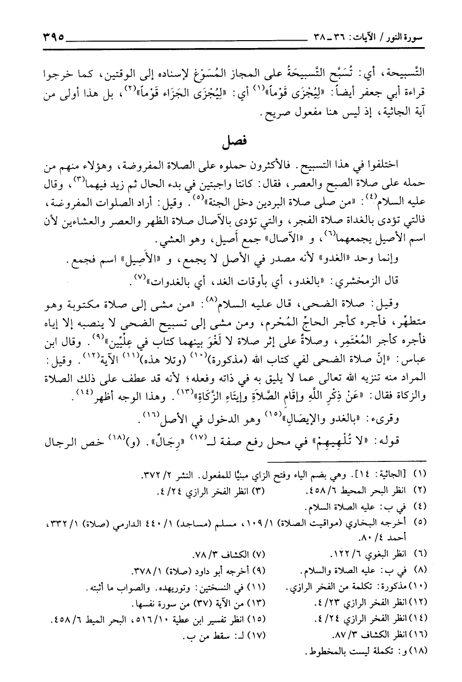 وقيل: صلاة الضحى، قال عليه السلام: «من مشى إلى صلاة مكتوبة وهو متطهِّر، فأجره كأجر الحاجِّ المُحْرم، ومن مشى إلى تسبيح الضحى لا ينصبه إلا إياه فأجره كأجر المُعْتَمِر، وصلاةٌ على إثر صلاة لا لَغْوَ بينهما كتاب في عِلِّيِّين» وقال ابن عباس: «إنّ صلاة الضحى لفي كتاب الله (مذكورة) (وتلا هذه) الآية. وقيل: المراد منه تنزيه الله تعالى عما لا يليق به في ذاته وفعله؛ لأنه قد عطف على ذلك الصلاة والزكاة فقال: {عَن ذِكْرِ الله وَإِقَامِ الصلاة وَإِيتَآءِ الزكاة} . وهذا الوجه أظهر.