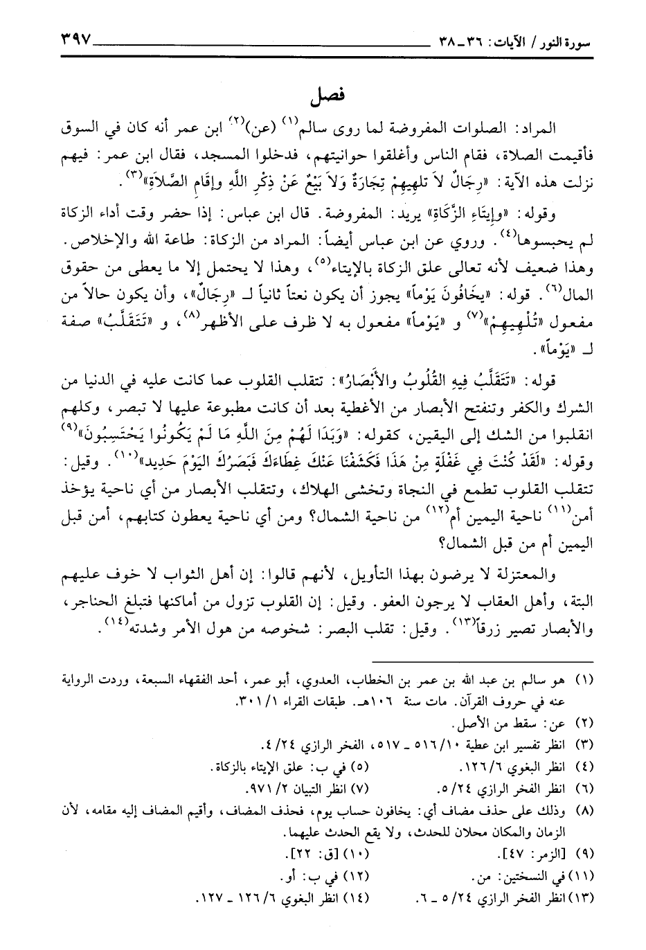 وقوله: «وإِيتَاءِ الزَّكَاةِ» يريد: المفروضة. قال ابن عباس: إذا حضر وقت أداء الزكاة لم يحبسوها. وروي عن ابن عباس أيضاً: المراد من الزكاة: طاعة الله والإخلاص. وهذا ضعيف لأنه تعالى علق الزكاة بالإيتاء، وهذا لا يحتمل إلا ما يعطى من حقوق المال. قوله: «يخَافُونَ يَوْماً» يجوز أن يكون نعتاً ثانياً ل «رِجَالٌ» ، وأن يكون حالاً من مفعول «تُلْهِيهِمْ» و «يَوْماً» مفعول به لا ظرف على الأظهر، و «تَتَقَلَّبُ» صفة ل «يَوْماً» .