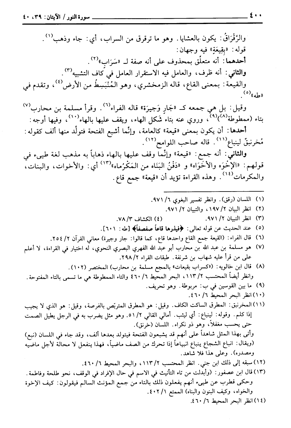 والثاني: أنه جمع: «قيعة» وإنَّما وقف عليها بالهاء ذهاباً به مذهب لغة طيئ في قولهم: «الإخْوَه والأخَوَاه» و «دَفْنُ البَنَاه من المَكْرُماه» أي: والأخوات، والبنات، والمكرمات. وهذه القراءة تؤيد أن «قيعة» جمع قاع.