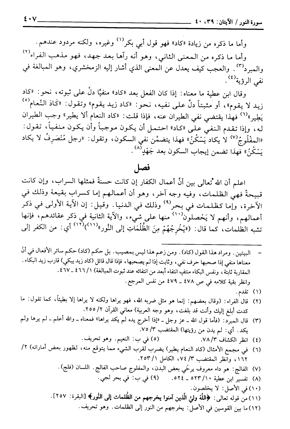 وقال ابن عطية ما معناه: إذا كان الفعل بعد «كاد» منفيًّا دلَّ على ثبوته، نحو: «كاد زيد لا يقوم» ، أو مثبتاً دلَّ على نفيه، نحو: «كاد زيد يقوم» وتقول: «كَادَ النَّعام يَطِير» فهذا يقتضي نفي الطيران عنه، فإذا قلت: «كاد النعام ألا يطير» وجب الطيران له، وإذا تقدم النفي على «كاد» احتمل أن يكون موجباً وأن يكون منفياً، تقول: «المفْلُوجُ لا يكاد يَسْكُنُ» فهذا يتضمَّن نفي السكون، وتقول: «رجل مُنْصَرِفٌ لا يكاد يَسْكُنُ» فهذا تضمن إيجاب السكون بعد جَهْدٍ.