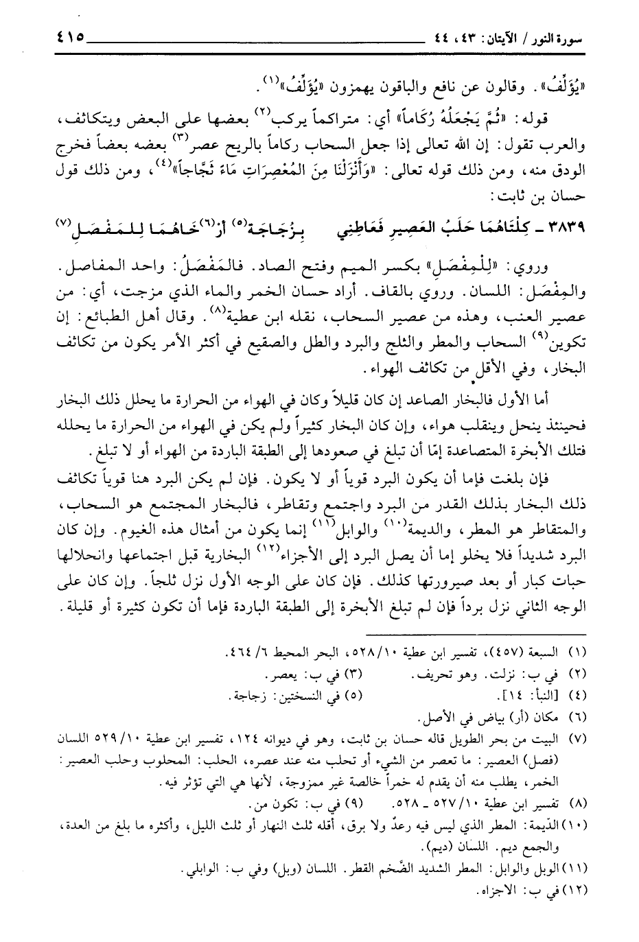 فإن بلغت فإما أن يكون البرد قوياً أو لا يكون. فإن لم يكن البرد هنا قوياً تكاثف ذلك البخار بذلك القدر من البرد واجتمع وتقاطر، فالبخار المجتمع هو السحاب، والمتقاطر هو المطر، والديمة والوابل إنما يكون من أمثال هذه الغيوم. وإن كان البرد شديداً فلا يخلو إما أن يصل البرد إلى الإجزاء البخارية قبل اجتماعها وانحلالها حبات كبار أو بعد صيرورتها كذلك. فإن كان على الوجه الأول نزل ثلجاً. وإن كان على الوجه الثاني نزل برداً فإن لم تبلغ الأبخرة إلى الطبقة الباردة فإما أن تكون كثيرة أو قليلة.