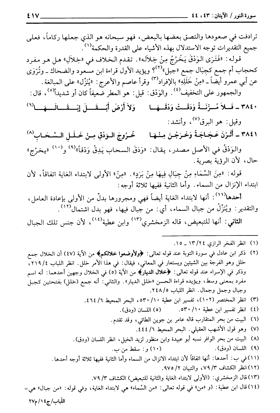 قوله: {فَتَرَى الودق يَخْرُجُ مِنْ خِلاَلِهِ} . تقدم الخلاف في «خِلاَلِ» هل هو مفرد كحجاب أم جمع كجِبَال جمع «جبل» ؟ ويؤيد الأول قراءة ابن مسعود والضحاك - وتُرْوَى عن أبي عمرو أيضاً - «مِنْ خَلَلِهِ» بالإفراد وقرأ عاصم والأعرج: «يُنَزِّل» على المبالغة.