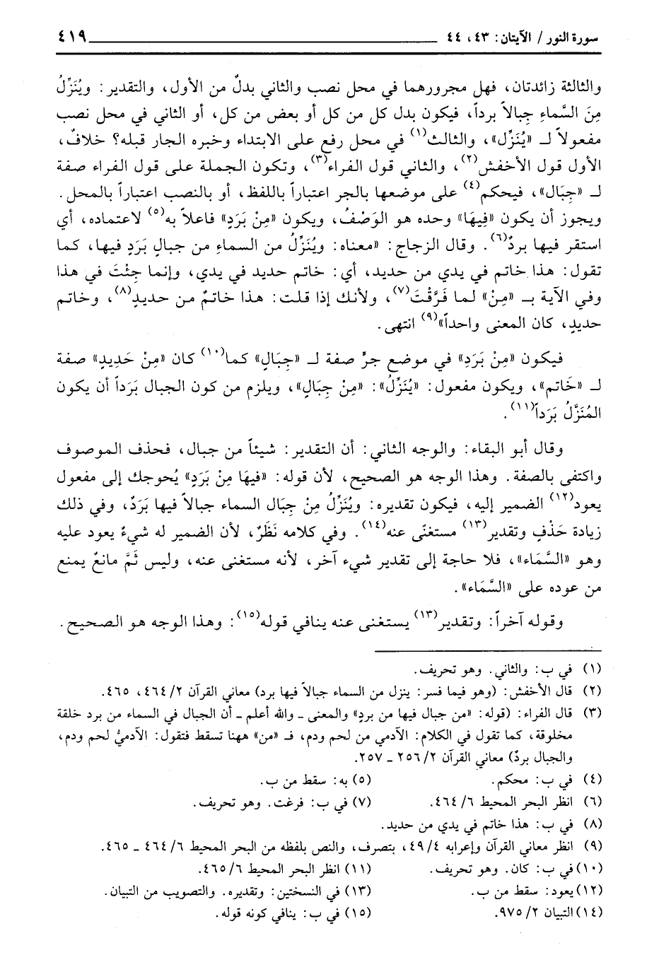 فيكون «مِنْ بَرَدِ» في موضع جرٍّ صفة ل «جِبَالٍ» كما كان «مِنْ حَدِيدٍ» صفة ل «خَاتم» ، ويكون مفعول: «يُنَزِّلُ» : «مِنْ جِبَالٍ» ، ويلزم من كون الجبال بَرَداً أن يكون المُنَزَّلُ بَرَداً.