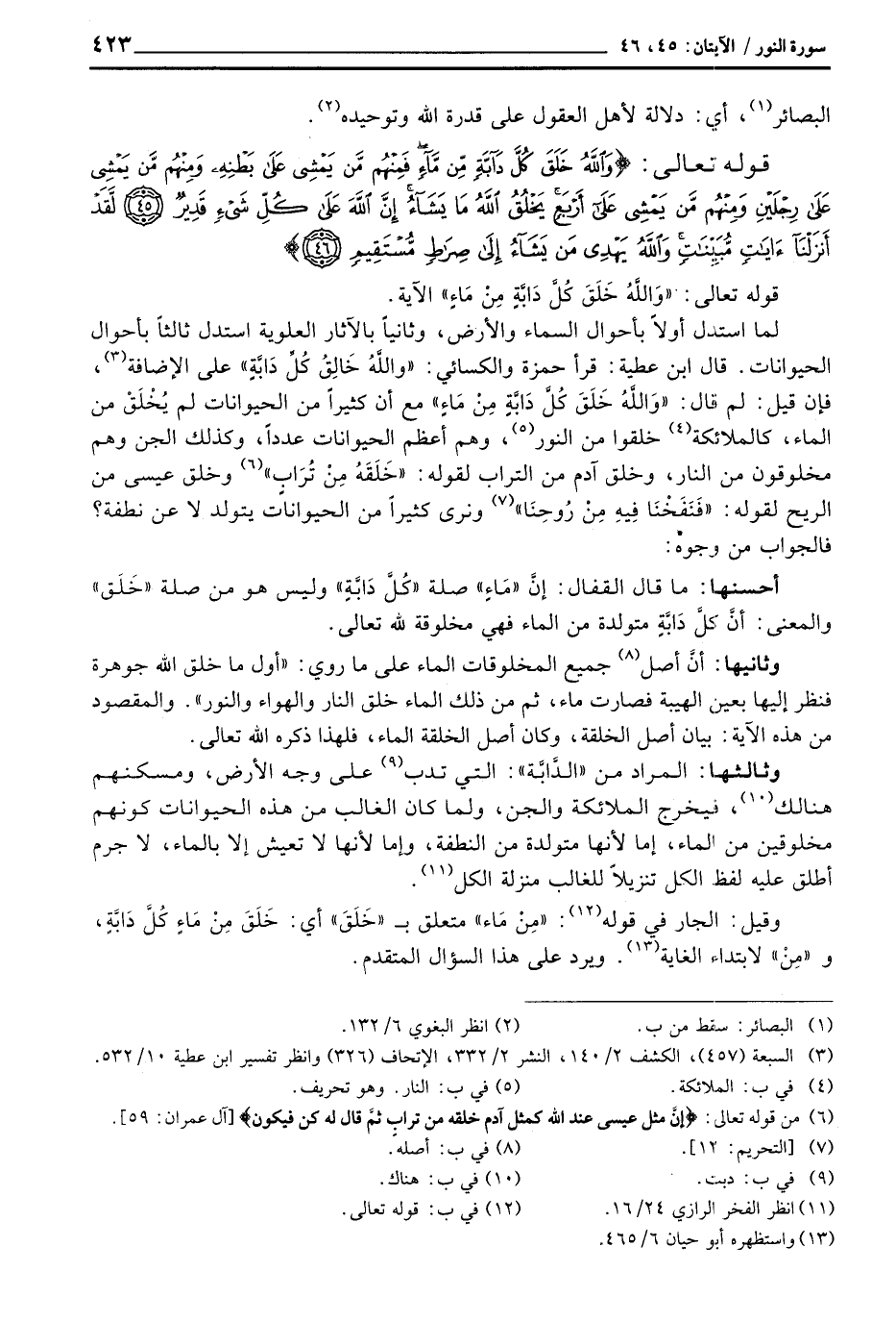 لما استدل أولاً بأحوال السماء والأرض، وثانياً بالآثار العلوية استدل ثالثاً بأحوال الحيوانات. قال ابن عطية: قرأ حمزة والكسائي: {واللَّهُ خَالِقُ كُلِّ دَابَّةٍ} على الإضافة، فإن قيل: لم قال: {والله خَلَقَ كُلَّ دَآبَّةٍ مِّن مَّآءٍ} مع أن كثيراً من الحيوانات لم يُخْلَقْ من الماء، كالملائكة خلقوا من النور، وهم أعظم الحيوانات عدداً، وكذلك الجن وهم مخلوقون من النار، وخلق آدم من التراب لقوله: {خَلَقَهُ مِن تُرَابٍ} [آل عمران: 59] وخلق عيسى من الريح لقوله: {فَنَفَخْنَا فِيهِ مِن رُّوحِنَا} [التحريم: 12] ونرى كثيراً من الحيوانات يتولد لا عن نطفة؟ فالجواب من وجوه: