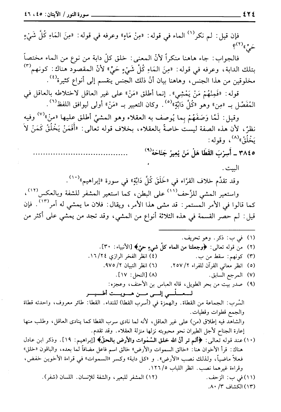 واستعير المشي للزَّحف على البطن، كما استعير المشفر للشفة وبالعكس، كما قالوا في الأمر المستمر: قد مشى هذا الأمر، ويقال: فلان ما يمشي له أمر. فإن قيل: لم حصر القسمة في هذه الثلاثة أنواع من المشي، وقد تجد من يمشي على أكثر من