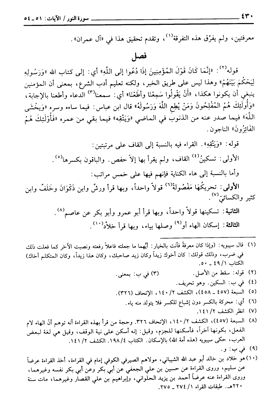 قوله: {إِنَّمَا كَانَ قَوْلَ المؤمنين إِذَا دعوا إِلَى الله} أي: إلى كتاب الله {وَرَسُولِهِ لِيَحْكُمَ بَيْنَهُمْ} وهذا ليس على طريق الخبر، ولكنه تعليم أدب الشرع، بمعنى أن المؤمنين ينبغي أن يكونوا هكذا، {أَن يَقُولُواْ سَمِعْنَا وَأَطَعْنَا} أي: سمعنا الدعاء وأطعنا بالإجابة، {وأولئك هُمُ المفلحون وَمَن يُطِعِ الله وَرَسُولَهُ} قال ابن عباس: فيما ساءه وسره «وَيخْشَى اللَّهَ» فيما صدر عنه من الذنوب في الماضي «وَيَتَّقِه» فيما بقي من عمره {فأولئك هُمُ الفآئزون} الناجون.