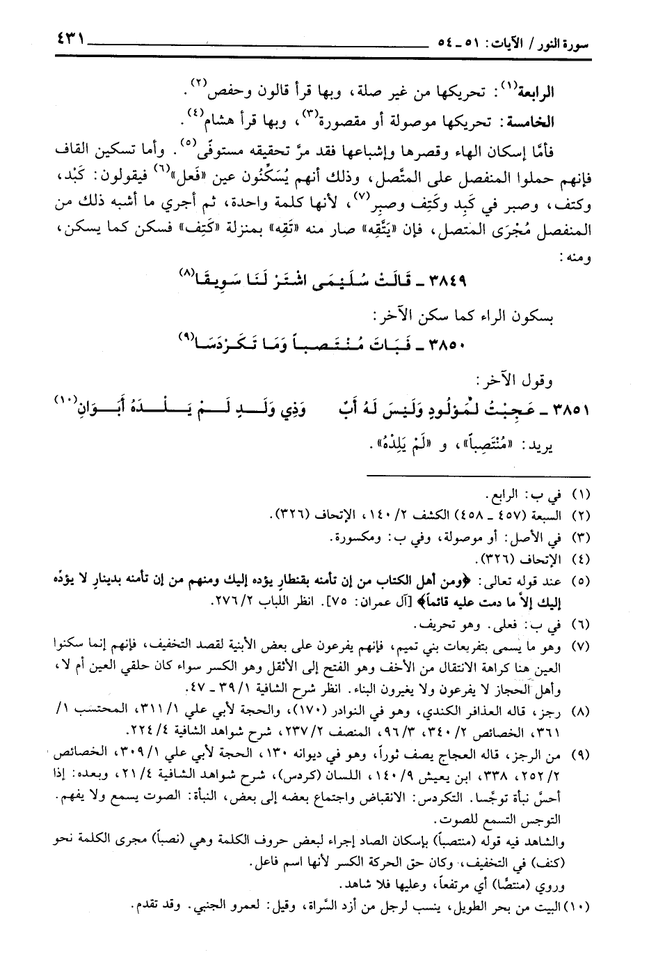 فأمَّا إسكان الهاء وقصرها وإشباعها فقد مرَّ تحقيقه مستوفًى. وأما تسكين القاف فإنهم حملوا المنفصل على المتَّصل، وذلك أنهم يُسَكِّنُون عين «فَعل» فيقولون: كَبْد، وكتف، وصبر في كَبِد وكَتِف وصبِر، لأنها كلمة واحدة، ثم أجري ما أشبه ذلك من المنفصل مُجْرَى المتصل، فإن «يَتَّقِه» صار منه «تَقِه» بمنزلة «كَتِف» فسكن كما يسكن، ومنه: