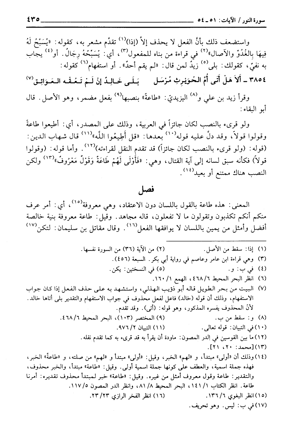 ولو قرئ بالنصب لكان جائزاً في العربية، وذلك على المصدر، أي: أطيعوا طاعةً وقولوا قولاً، وقد دلَّ عليه قوله بعدها: {قُلْ أَطِيعُواْ الله} قال شهاب الدين: (قوله: (ولو قرئ بالنصب لكان جائزاً) قد تقدم النقل لقراءته) .