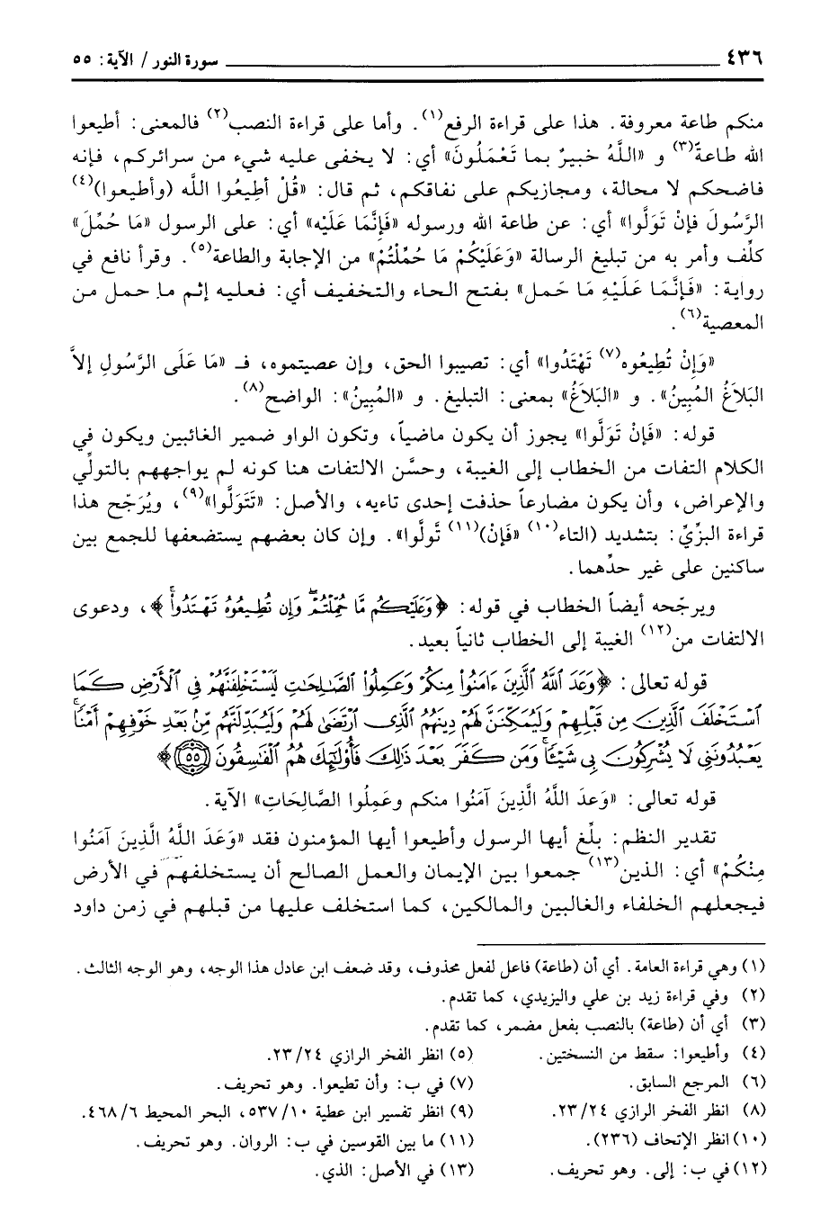 منكم طاعة معروفة. هذا على قراءة الرفع. وأما على قراءة النصب فالمعنى: أطيعوا الله طاعةً و {الله خَبِيرٌ بِمَا تَعْمَلُونَ} أي: لا يخفى عليه شيء من سرائركم، فإنه فاضحكم لا محالة، ومجازيكم على نفاقكم، ثم قال: {قُلْ أَطِيعُواْ الله (وَأَطِيعُواْ) الرسول فَإِن تَوَلَّوْاْ} أي: عن طاعة الله ورسوله «فَإِنَّمَا عَلَيْه» أي: على الرسول «مَا حُمِّلَ» كلِّف وأمر به من تبليغ الرسالة {وَعَلَيْكُمْ مَّا حُمِّلْتُمْ} من الإجابة والطاعة. وقرأ نافع في رواية: {فَإنَّمَا عَلَيْهِ مَا حَمل} بفتح الحاء والتخفيف أي: فعليه إثم ما حمل من المعصية.
