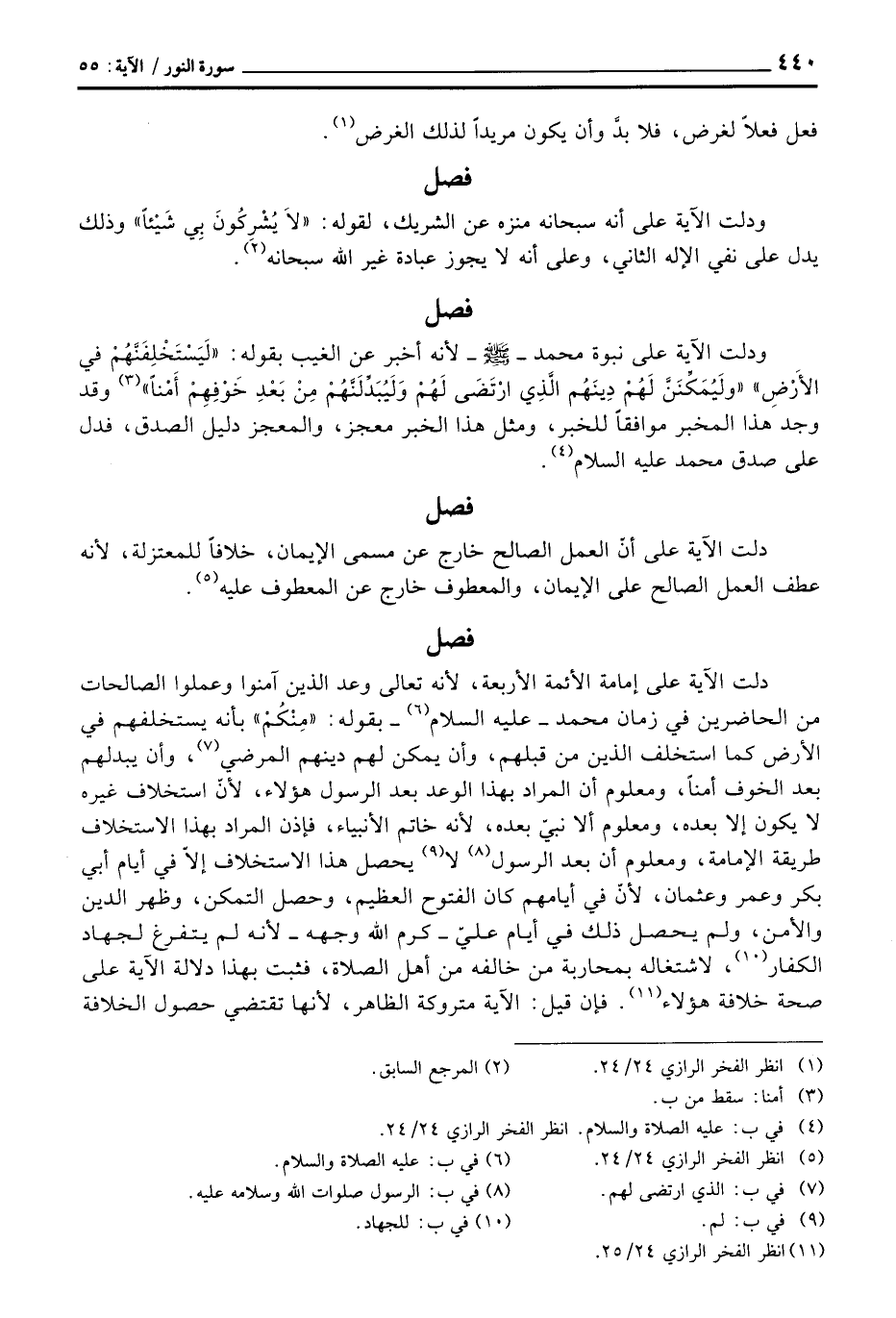 دلت الآية على إمامة الأئمة الأربعة، لأنه تعالى وعد الذين آمنوا وعملوا الصالحات من الحاضرين في زمان محمد - عليه السلام - بقوله: «مِنْكُمْ» بأنه يستخلفهم في الأرض كما استخلف الذين من قبلهم، وأن يمكن لهم دينهم المرضي، وأن يبدلهم بعد الخوف أمناً، ومعلوم أن المراد بهذا الوعد بعد الرسول هؤلاء، لأن استخلاف غيره لا يكون إلا بعده، ومعلوم ألا نبيّ بعده، لأنه خاتم الأنبياء، فإذن المراد بهذا الاستخلاف طريقة الإمامة، ومعلوم أن بعد الرسول لا يحصل هذا الاستخلاف إلاّ في أيام أبي بكر وعمر وعثمان، لأنّ في أيامهم كان الفتوح العظيم، وحصل التمكن، وظهر الدين والأمن، ولم يحصل ذلك في أيام عليّ - كرم الله وجهه - لأنه لم يتفرغ لجهاد الكفار، لاشتغاله بمحاربة من خالفه من أهل الصلاة، فثبت بهذا دلالة الآية على صحة خلافة هؤلاء. فإن قيل: الآية متروكة الظاهر، لأنها تقتضي حصول الخلافة
