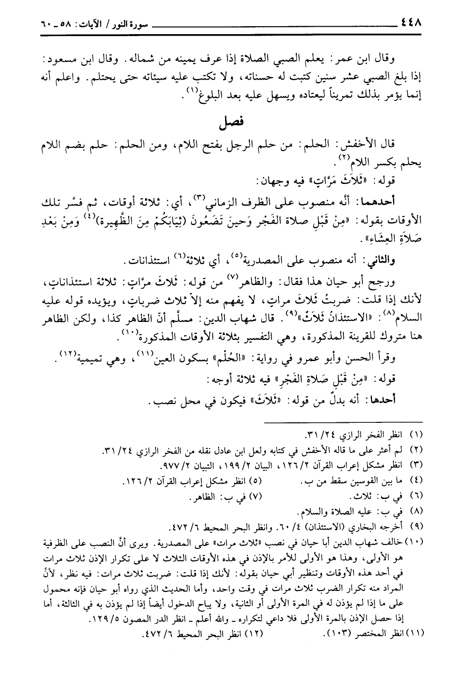 ورجح أبو حيان هذا فقال: والظاهر من قوله: ثَلاثَ مرَّاتٍ: ثلاثة استئذاناتٍ، لأنك إذا قلت: ضربتُ ثَلاثَ مراتٍ، لا يفهم منه إلاّ ثلاث ضرباتٍ، ويؤيده قوله عليه السلام: «الاستئذانُ ثَلاَثٌ» قال شهاب الدين: مسلَّم أنّ الظاهر كذا، ولكن الظاهر هنا متروك للقرينة المذكورة، وهي التفسير بثلاثة الأوقات المذكورة.