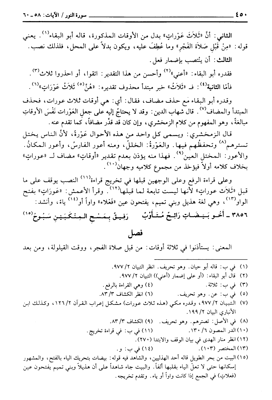 وعلى قراءة الرفع وعلى الوجهين قبلها في تخريج قراءة النصب يوقف على ما قبل «ثَلاَثَ عوراتٍ» لأنها ليست تابعة لما قبلها. وقرأ الأعمش: «عَورَاتٍ» بفتح الواو، وهي لغة هذيل وبني تميم، يفتحون عين «فَعْلاء» واواً أو ياءً، وأنشد: