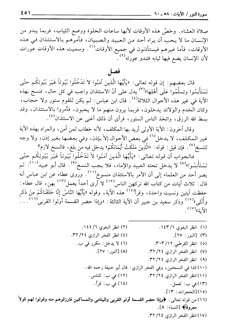 قال بعضهم: إن قوله تعالى: {يا أيها الذين آمَنُواْ لاَ تَدْخُلُواْ بُيُوتاً غَيْرَ بُيُوتِكُمْ حتى تَسْتَأْنِسُواْ وَتُسَلِّمُواْ على أَهْلِهَا} [النور: 27] يدل على أنّ الاستئذان واجب في كل حال، فنسخ بهذه الآية في غير هذه الأحوال الثلاثة. قال ابن عباس: لم يكن للقوم ستور ولا حجاب، وكان الخدم والولائد يدخلون، فربما يرون منهم ما لا يحبون، فأمروا بالاستئذان، وقد بسط الله الرزق، واتخذ الناس الستور، فرأى أن ذلك أغنى عن الاستئذان.