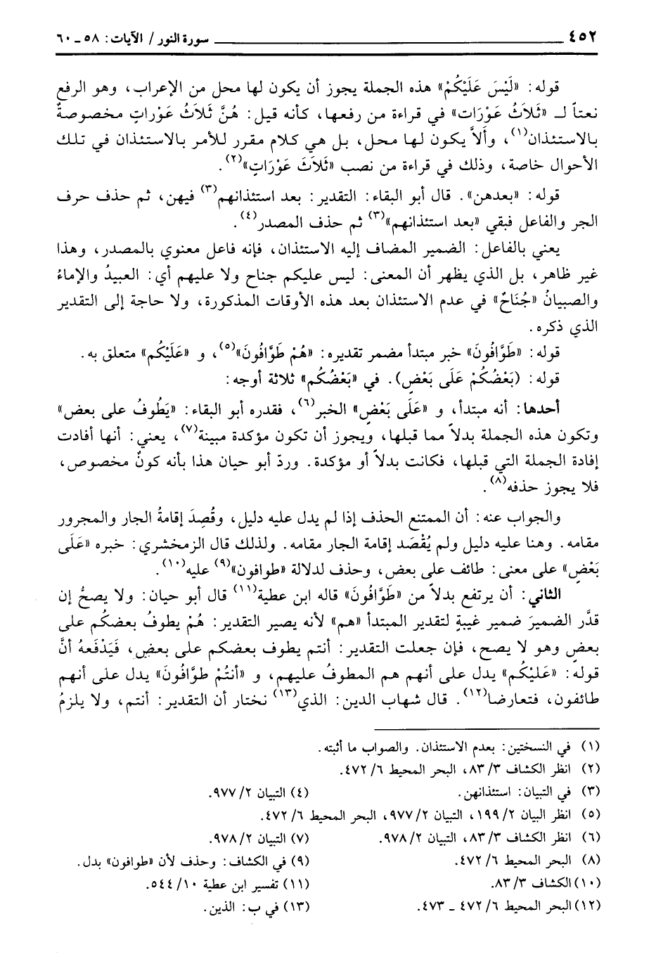الثاني: أن يرتفع بدلاً من «طَوَّافُونَ» قاله ابن عطية قال أبو حيان: ولا يصحُّ إن قدَّر الضميرَ ضمير غيبةٍ لتقدير المبتدأ «هم» لأنه يصير التقدير: هُمْ يطوفُ بعضكُم على بعضٍ وهو لا يصح، فإن جعلت التقدير: أنتم يطوف بعضكم على بعض، فَيَدْفَعهُ أنَّ قوله: «عَليْكُم» يدل على أنهم هم المطوفُ عليهم، و «أنتُمْ طَوَّافُونَ» يدل على أنهم طائفون، فتعارضا. قال شهاب الدين: الذي نختار أن التقدير: أنتم، ولا يلزمُ