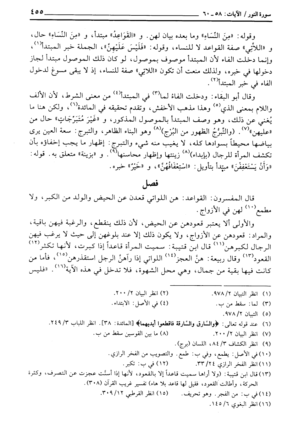 وقال أبو البقاء: ودخلت الفاءُ لما في المبتدأ من معنى الشرط، لأن الألف واللام بمعنى الذي وهذا مذهب الأخفش، وتقدم تحقيقه في المائدة، ولكن هنا ما يُغني عن ذلك، وهو وصف المبتدأ بالموصول المذكور، و «غَيْرَ مُتَبَرِّجَاتٍ» حال من «عليهن» . (والتَّبرُّجُ الظهور من البُرْج) وهو البناء الظاهر، والتبرج: سعة العين يرى بياضها محيطاً بسوادها كله، لا يغيب منه شيء والتبرج: إظهار ما يجب إخفاؤه بأن تكشف المرأة للرجال (بإبداء) زينتها وإظهار محاسنها. و «بزينة» متعلق به. قوله: «وَأَنْ يَسْتَعْفِفْنَ» مبتدأ بتأويل: «اسْتِعْفَافُهُنَّ» ، و «خَيْرٌ» خبره.