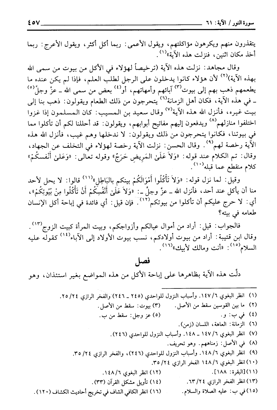 وقال مجاهد: نزلت هذه الآية (ترخيصاً لهؤلاء في الأكل من بيوت من سمى الله بهذه الآية) لأن هؤلاء كانوا يدخلون على الرجل لطلب العلم، فإذا لم يكن عنده ما يطعمهم ذهب بهم إلى بيوت آبائهم وأمهاتهم، أو بعض من سمى الله - عزَّ وجلَّ - في هذه الآية، فكان أهل الزمانة يتحرجون من ذلك الطعام ويقولون: ذهب بنا إلى بيت غيره، فأنزل الله هذه الآية وقال سعيد بن المسيب: كان المسلمون إذا غزوا اختلفوا منازلهم ويدفعون إليهم مفاتيح أبوابهم، ويقولون: قد أحللنا لكم أن تأكلوا مما في بيوتنا، فكانوا يتحرجون من ذلك ويقولون: لا ندخلها وهم غيب، فأنزل الله هذه الآية رخصة لهم. وقال الحسن: نزلت الآية رخصة لهؤلاء في التخلف عن الجهاد، وقال: تم الكلام عند قوله: {وَلاَ عَلَى المريض حَرَجٌ} وقوله تعالى: «وَعَلى أَنْفسكُمْ» كلام منقطع عما قبله.